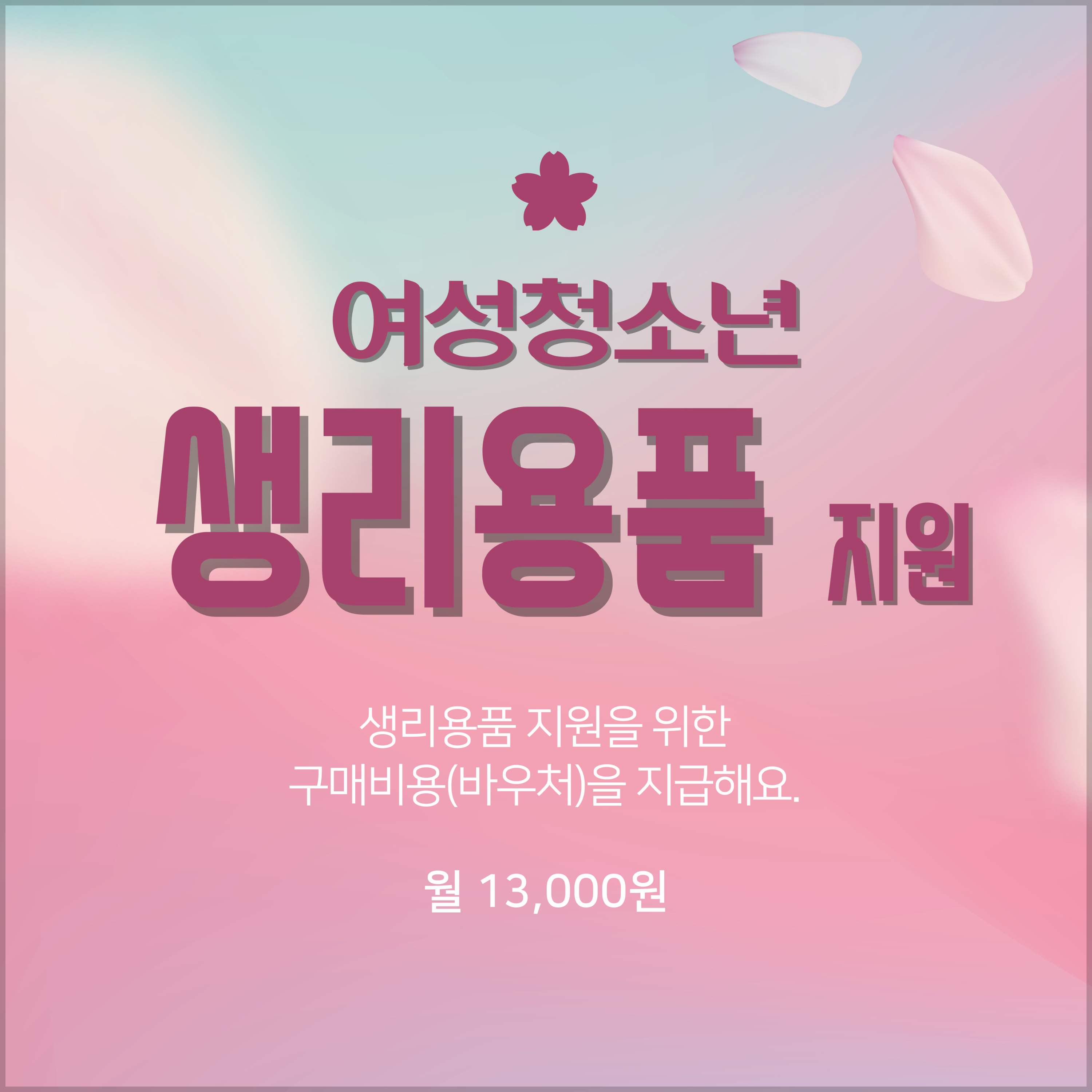 - 여성청소년 생리용품 바우처 지원(월 1만 3,000원), 국민행복카드로 구매