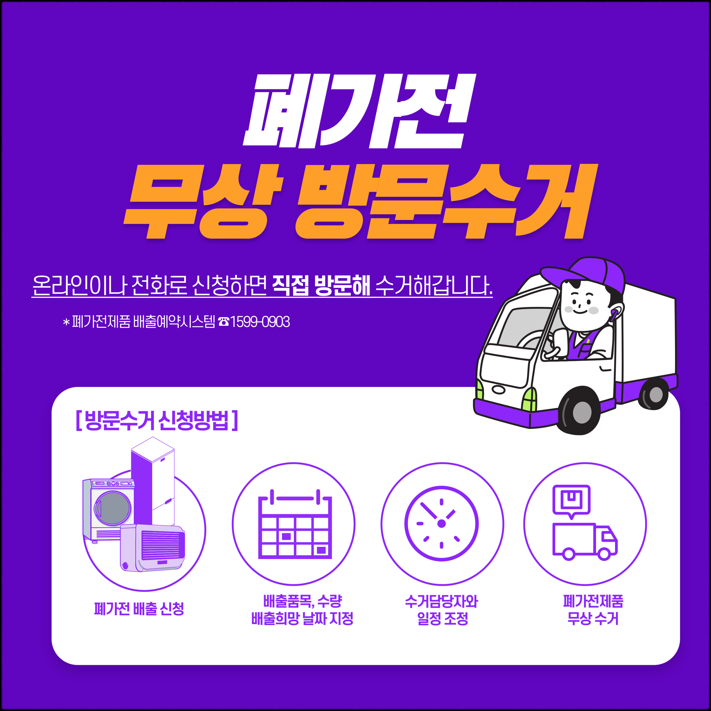 - 온라인 신청: 폐가전제품 배출예약시스템(www.15990903.or.kr)